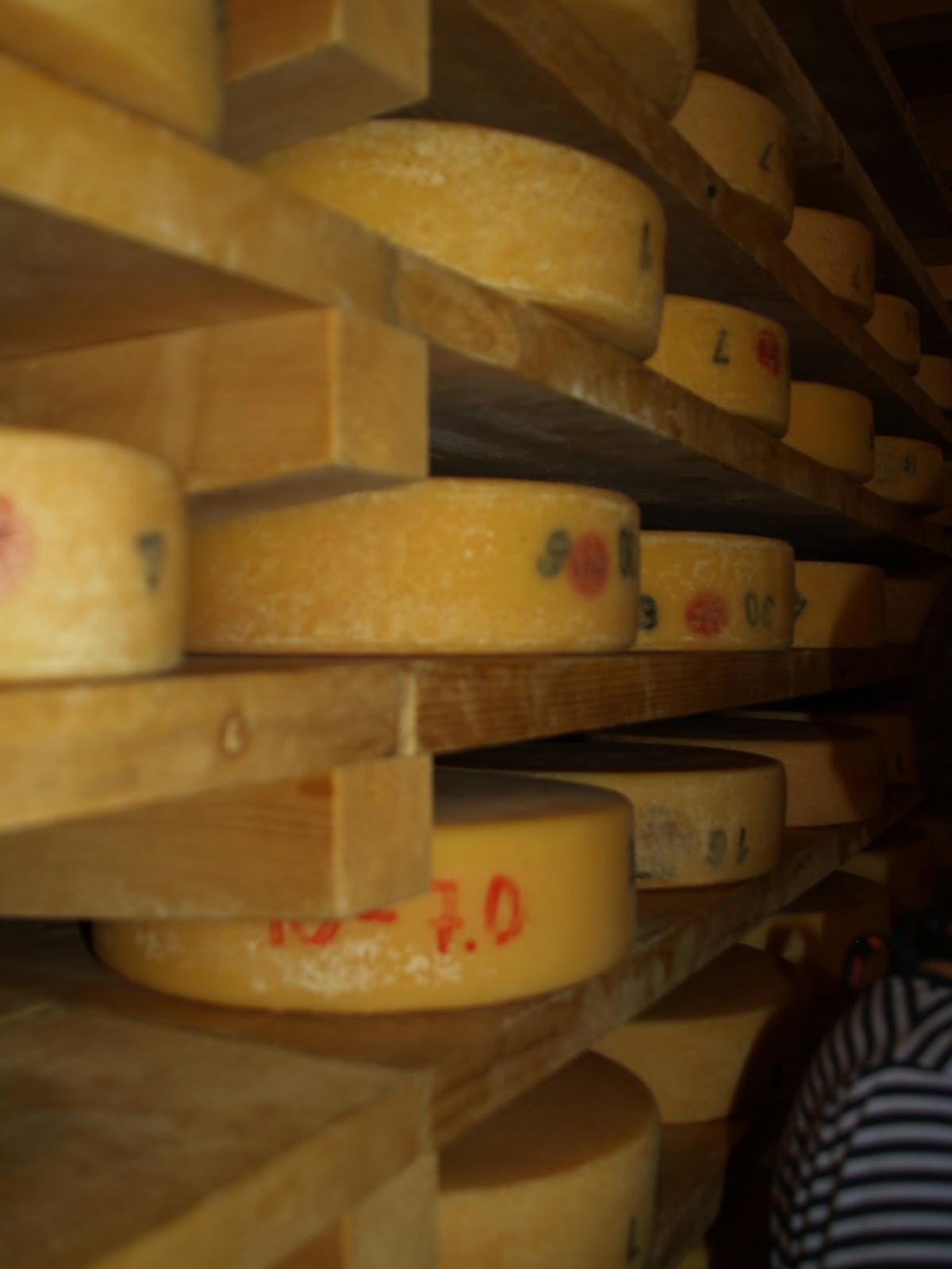 At the factory we were introduced to the young woman, who explained that the cows were grazing "over the hill" so we couldn't see them, but she and her partner had milked them all that morning, and would again that evening. 90 cows, twice a day, every day. Well, she admitted somewhat sheepishly, about half the cows were now pregnant and not giving milk, so the work load was dramatically reduced... 45 cows, twice a day, every day. The milk was then hauled to the small building we were standing in front of, where it was poured into a large vat and heated. How hot the milk was made determined the hardness of the cheese they were making (higher heat resulted in firmer cheese). Once it reached the correct temperature there were enzymes and rennet added. This caused the cheese to form curds, which were laboriously scooped out into large cheesecloth bags and placed in molds. The moisture was then squeezed out of the mold for a short period of time, and then the cheese was taken to the aging building where it was soaked in salt water to form the rind and then placed up on the aging shelf.